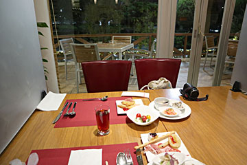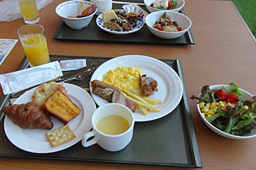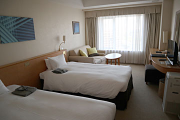 今回の宿は、新浦安駅から徒歩7分の「ホテルエミオン」。先日泊まった、オリエンタルホテル東京ベイの近くです。夕朝食、温泉付きで\18,400/二人の安いプランを見つけたのと、WEBの評判も良かったので来てみました。温泉は2Fにありましたが、そんなに広くなかったので、全部のプランに温泉が付いている訳ではなさそうです。