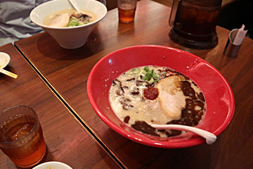 博多ラーメンの店「一風堂」でラーメン。赤丸と白丸のカタ麺。