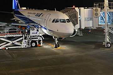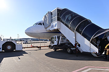 羽田から鳥取コナン空港行きの飛行機に乗ります。機材はA321、バスで近くまで行って、タラップで乗りました。