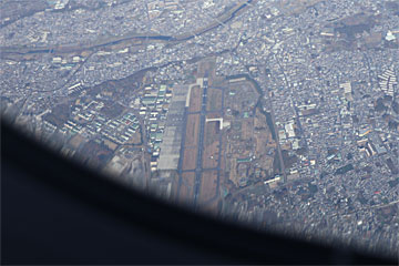 昔は、太平洋沿岸に沿って飛んだような気がしますが、今回は羽田からスカイツリーの方に内陸を飛んで、入間基地(狭山市)の上空を行きました。