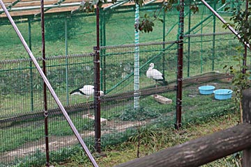 観察広場。今、野鳥の間で鳥インフルエンザが流行っているのだそうで、うつされないように、施設のコウノトリはケージに入っていました。