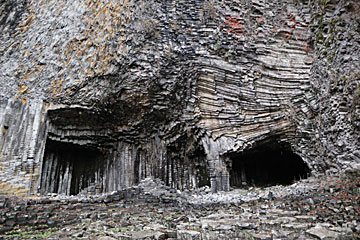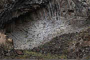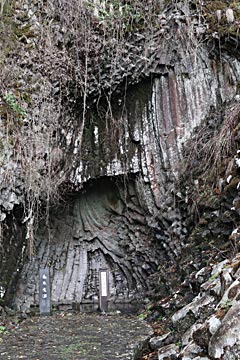 左手にある、白虎洞。横向きの柱状節理(マグマが冷えて固まったときに割れたもの)が見えます