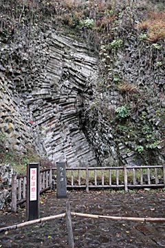 右側にあるのが青龍洞。柱状節理が美しく曲がっています。