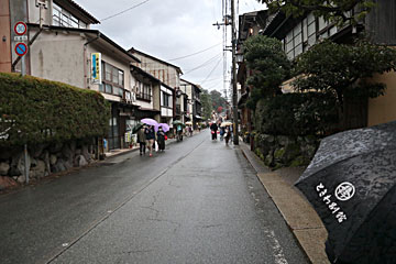 食事は午後6時からなので、それまで城崎の街中を散策します。傘は宿の傘を使うお約束です。(城崎温泉には外湯が7件あり、宿でもらったQRコードを見せますが、傘は昔から泊り客の目印らしい)。