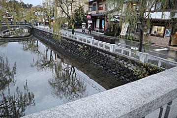 温泉街を川(大谿川/おおたにがわ)が流れており、良い雰囲気です。護岸には、先ほど見てきた玄武洞の玄武岩が使われています。