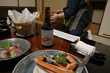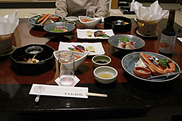 今回の宿(ときわ別館)は、昔ながらの旅館でした。夕朝食はお部屋で、仲居さんが持って来てくれますし、夕食を食べ終わって電話をすると、食器を下げて、布団を敷いてくれます。冬の城崎温泉は(今年は11/16に解禁された)カニがメインだそうで、それを目当てに関西から観光客がたくさん来るとのこと。