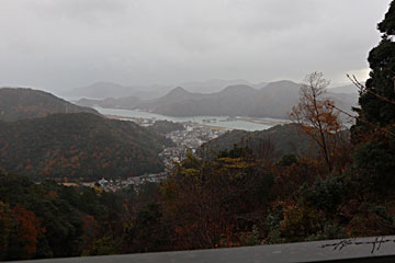 山頂からの眺め。城崎温泉と、その周りの山々が見えるのですが、山頂に着いた頃、ちょうど大雨で、けぶっていました。