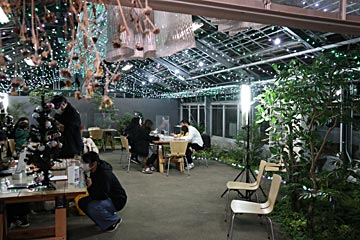 奥の「アトリエ ローズファーム」でのアクティビティ「みんなで作るクリスマスツリー」。