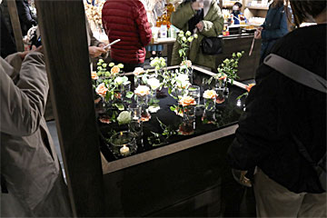 ローズファームマーケット(売店)のバラのディスプレイ。台に水を張って、コップに浮かべてあります。