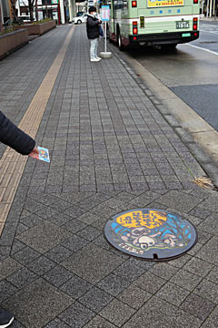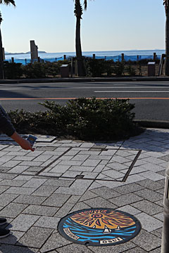 実物のマンホールは、海岸沿いの道、ステーキ屋さんの前にありました