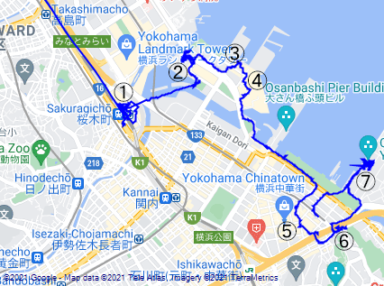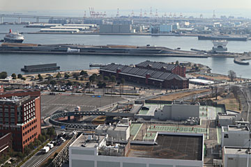 横浜の港が一望できます。画面中央は、赤レンガ倉庫、その奥は大桟橋、左奥はベイブリッジ。
