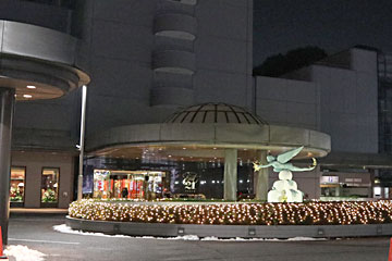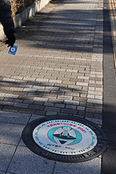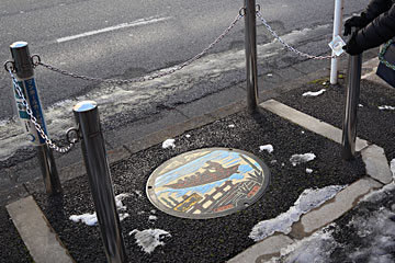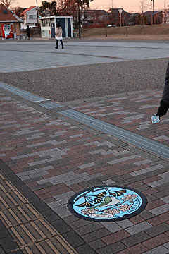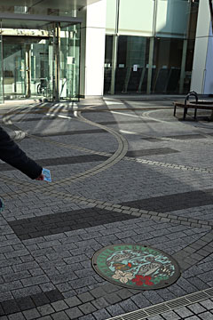 松戸駅に来ました。駅から歩いてちょっとのところの観光協会でマンホールカードを入手。実物のマンホールも(一昨日の雪で埋まっているのでは?と心配しましたが)その先の松戸市民劇場の前、ポールで囲まれた中にありました。