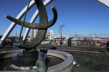牛久シャトーから駅に戻る歩道橋の上にあった牛久日時計。手前にいるのは河童のブロンズ像。