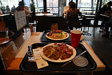フードコートの席が取れたので、パンダエクスプレスのランチ。プレートで、焼きそば(チャオメン)に、オレンジチキンとモンゴリアンポークをトッピング。