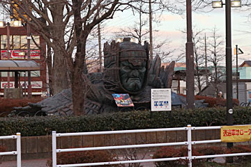 東所沢駅近くの道路横にあった「大魔神」。「妖怪大戦争展2021 ヤミットに集結せよ!」(KADOKAWA)の宣伝のようです。