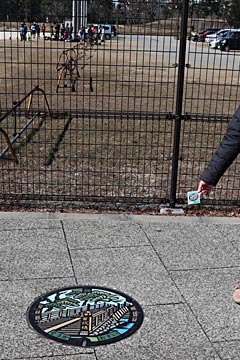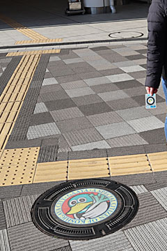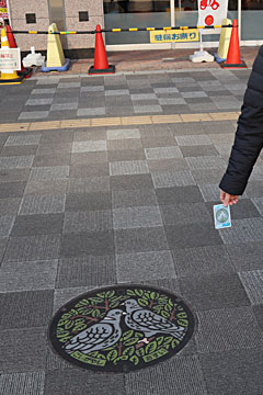 実際のマンホールは、新三郷駅前の自転車置き場とバス停の間にありました。