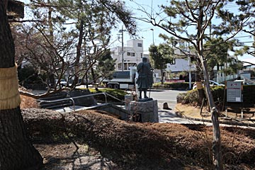←「草加宿芭蕉庵」の横にいらしたブロンズ像は松尾芭蕉さん。奥は旧日光街道。