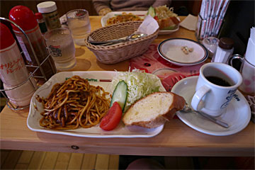 コメダ珈琲草加店でスパゲティ(飲み物+¥800)のランチ。コメダのパンは特大だったので身構えましたが、スパゲティは普通の量だった。