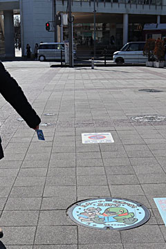 越谷市では、越谷レイクタウンの越谷市観光協会水辺のまちづくり館で「シラコバト」の、越谷駅近くの「ガーヤちゃんの蔵屋敷」でガーヤちゃんのマンホールカードをもらいました。実物の(カラーの)マンホールは、どちらも越谷駅前にありました。