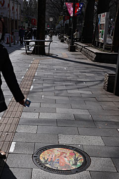 調布市では、調布駅前広場の調布市観光案内所「ぬくもりステーション」で、ゲゲゲの鬼太郎のマンホールカードをもらいました。昭和34年から在住していた名誉市民・故水木しげる氏の代表作「ゲゲゲの鬼太郎」をモチーフにしたマンホール蓋です。(カード裏に書かれた「デザインの由来」・一部)。調布駅は地下にあり「ぬくもりステーション」は、駅前広場の真ん中にポツンと建っていました。