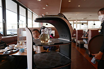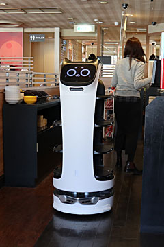 12時半過ぎに、東八道路沿いのガスト三鷹店でランチにしました。猫の手も借りたいわけではないでしょうが、ネコちゃんロボットが料理を運ぶのを手伝っていました。うちのテーブルはお姉さんが料理を運んできたけど、ネコちゃんロボットは、注文していない白ワインのデカンタを持ってきて、そのまま戻っていきました。