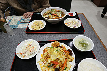 6Fレストラン街の中華屋(餃子の王様 龍吟)で、ホイコーローと五目飯(+半炒飯)の定食(各¥1,100)