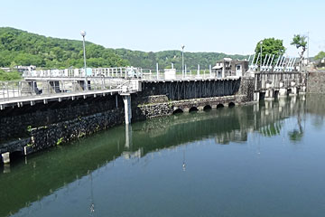 多摩川の水を玉川上水に引き込む羽村堰。奥が多摩川の水をせき止める羽村取水堰。手前が余分な水を多摩川に戻す、小吐水門。