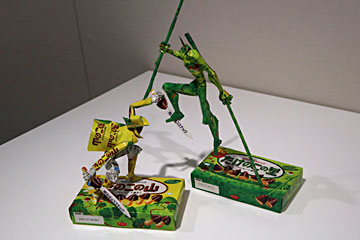 空箱職人 はるきる展。身近なお菓子の箱などのパッケージをアート作品に変化させています。