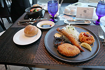 夕食。メインを選んで、あとはバイキング。当方のメインは「有頭海老フライとカニクリームコロッケ」。