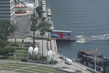 先日八ッ場ダムで乗ったダックツアーと同様の、水陸両用バス「スカイダック横浜」が陸と海を出入りしているのが見えました。