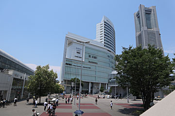 今回の宿は、桜木町駅(写真左)前、コレットマーレ(ショッピングタウン)上の「ニューオータニイン横浜プレミアム」。右の建物は横浜ランドマークタワー。