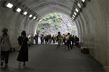 清津峡入口。左にトンネル全図が書いてありますが、赤丸が入口、奥の左側に見晴所が3つあり、くるっと左に180°曲がった先に終点のパノラマステーションがあります。
