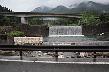 清津川は写真の右側から流れてきて、ここで90°右に曲がり奥に流れて行きます
