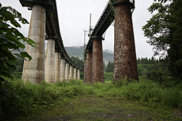 毛渡沢の奥にある毛渡沢橋梁。右側の上り線はレンガ積み、左の下り線はコンクリ作りになっており、時代の差を感じます。先日谷川岳のあとに行った土合駅(群馬県側)から新清水トンネルを通って新潟側に出たところにあたり、右側が土合駅の地上駅、左側が土合駅の地下ホームとつながっています。
