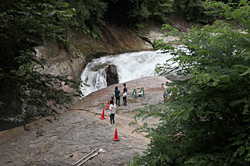 降りて来ました。断崖の岩肌もすごいです。こちらの滝は「鱒飛の滝」です。