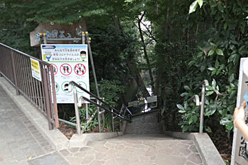 さらに進み、橋(利剣の橋)を渡った左側が神変大菩薩堂、水が2筋したたっていました(不動の滝)。奥の階段を上がったところが等々力不動尊。
