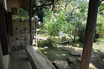 日本庭園内の書院で、冷水器の水を飲んで一休み。