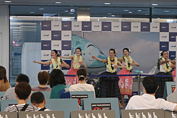 バスに搭乗する待合室で、CAさんたちがフラダンスを見せてくれました。