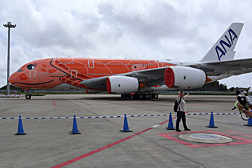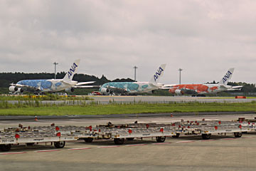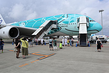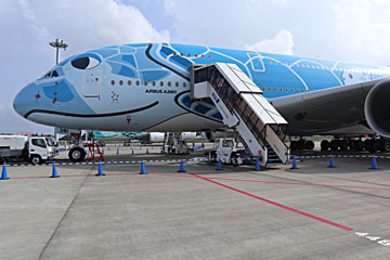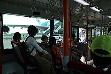 ANAが成田-ハワイ便のために買った、総二階建てのエアバスA380にバスで近づきます。2機しかいない時もあるのだそうですが、この日は3機とも揃っていてラッキーでした。