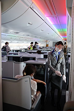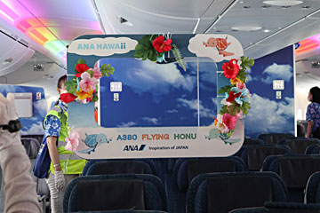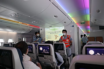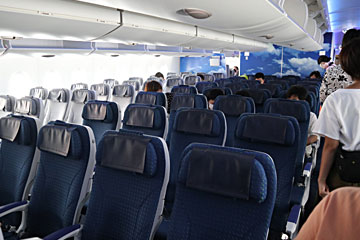 食事が終わり、隣の1号機「ラニ」君を見学に行きます。薄い手袋が配られ、機内で空いている席には座っても良いとのこと。