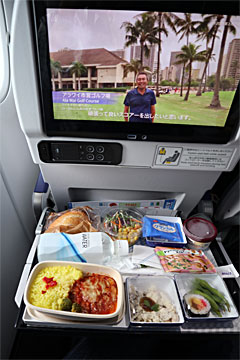 11時過ぎに機内に入りましたが、宣伝とか色々あり、ちょうど12時頃に食事が配られました。メインはビーフハンバーグ イタリアントマトソース。国際線なので(?)アルコールも注文できます。当方はプレモル(ビール)を頂きました。
