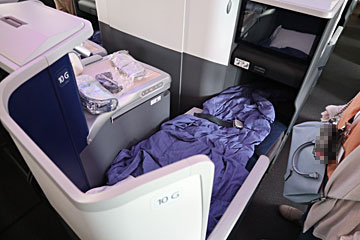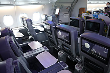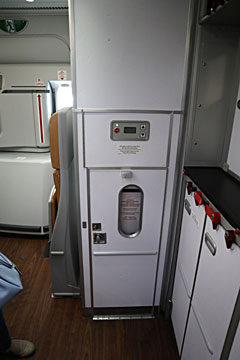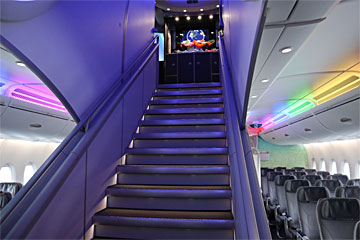 後方の狭い階段(基本CAさん用)を登って、2Fに来ました。ここはプレミアムエコノミークラス。
