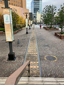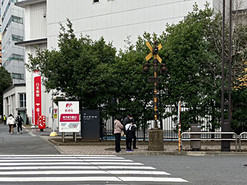 新橋駅。電通の先、最近解体された中銀ビルの近くに、線路がない踏切がありました。ここに実際にあった、旧汐留駅と築地市場との引き込み線の踏切だそう。