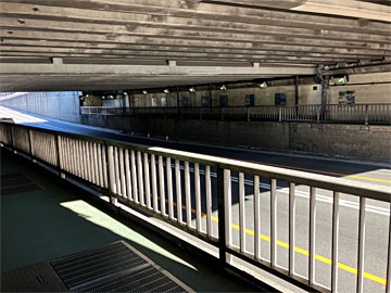 中央線をくぐる、環八のアンダーパス。両側に歩道があります。