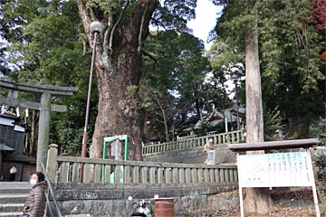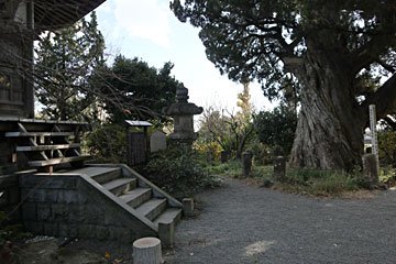 左は六角形の「七騎堂」。右は、樹齢900年の「びゃくしん」がねじれて生えています。