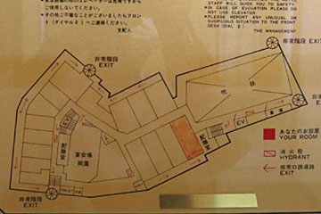ドアの内側に貼ってあった3Fのフロアマップ(避難経路案内)。新築当時(昭和37年?)から変わっていないものと思われますが、現在は左上に行く廊下は、大浴場などがある隣の建物(東館)と渡り廊下でつながっています。