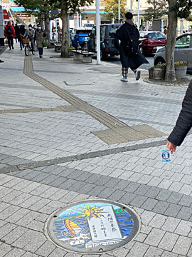 逗子市役所の守衛さんから「太陽の季節記念碑」のマンホールカードをもらいました。実物のカラーマンホールは、逗子駅前にありました。