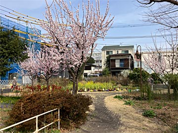 公園内にある新宿スポーツセンター入り口の左右には、早咲きの彼岸桜が満開。