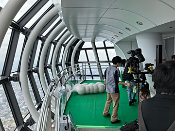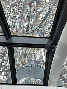 スカイツリーも、東京タワーと同様、メインデッキ(展望デッキ・350m)とトップデッキ(展望回廊・450m)とに分かれており、上に登るにはさらにお金がかかります。今回は、ずらし旅のクーポンで、展望回廊も見学させてもらい、スイーツ(バナナジュース)も頂きました。