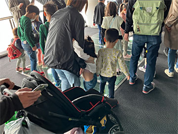 エスカレータで1F下がるとフロア340、5Fに降りるエレベータの待ち行列に、ガラス床があります。